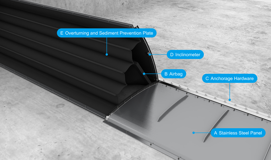 Airbag Body / Stainless Steel Panel / Anchorage Hardware / Concrete Foundation / Mechanical Equipment / Air Supply Pipe