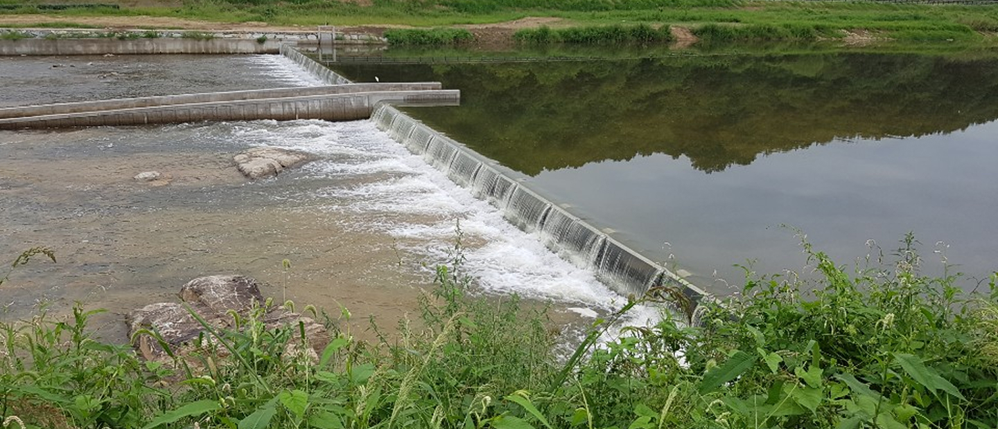 A movable weir that raises and lowers the upper stainless steel panel by supplying and releasing air to and from an airbag, designed for increased durability and easy maintenance.
