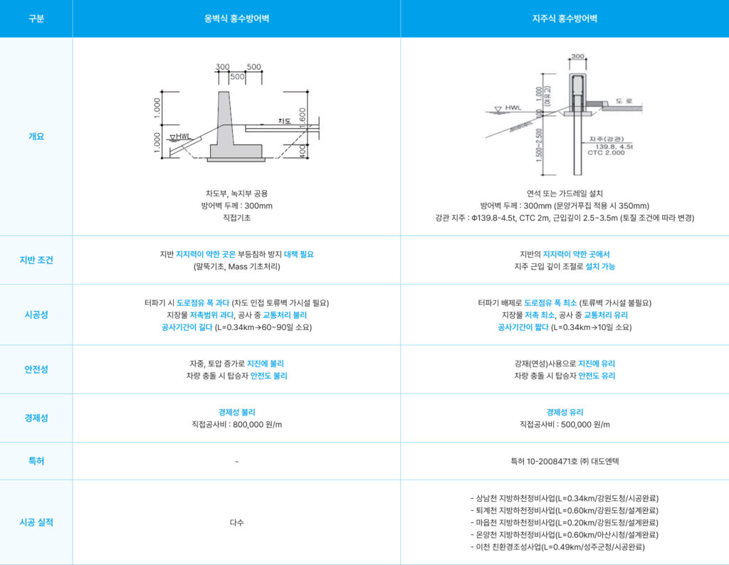 기존 옹벽식 홍수방어벽의 한계를 극복 (경제성, 안전성, 시공성 확보)